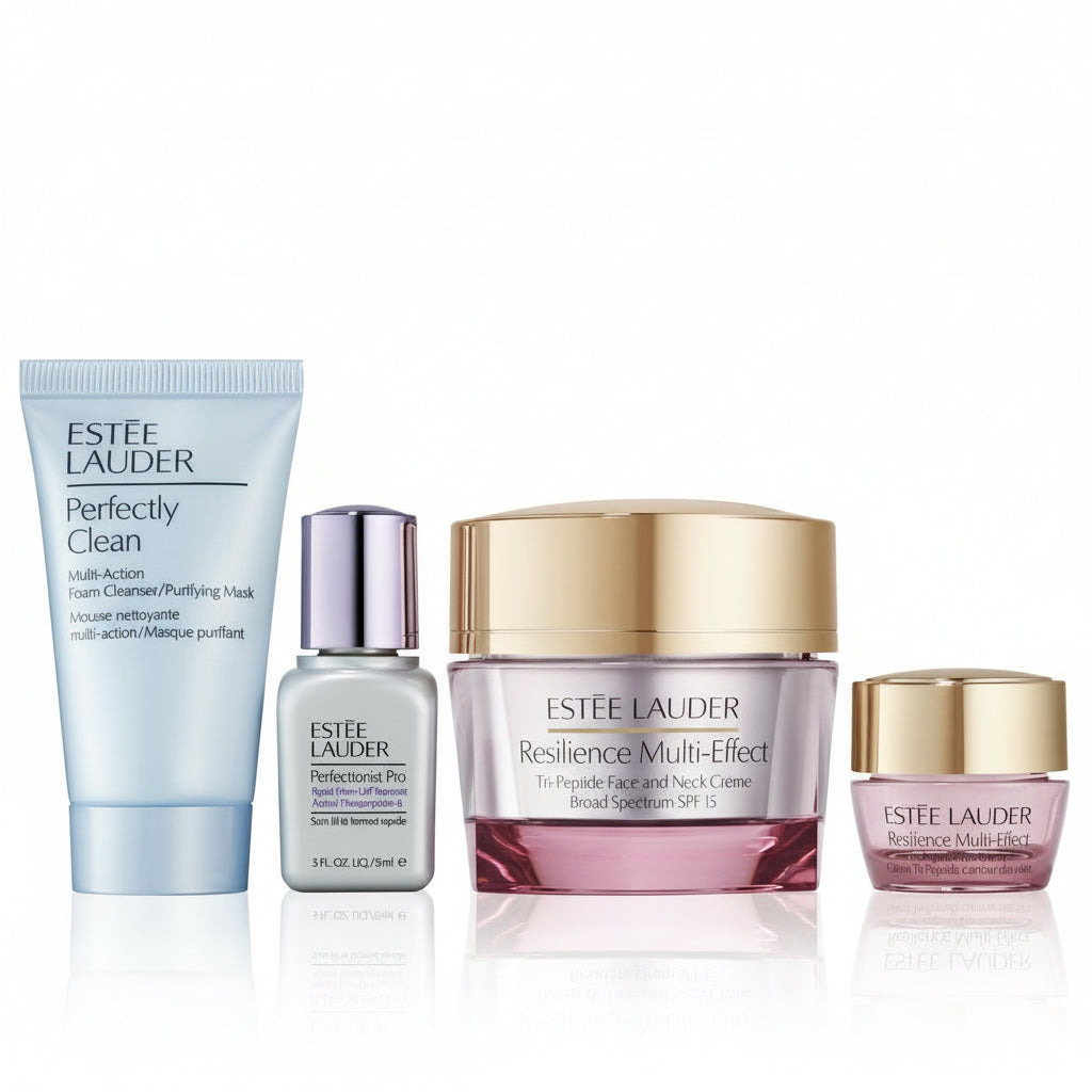 O Conjunto Estée Lauder Resilience oferece uma rotina completa de cuidados anti-idade, combinando limpeza profunda, hidratação intensa, ação iluminadora e cuidado específico para a zona do contorno dos olhos. Os quatro produtos atuam em sinergia para melhorar a firmeza, a luminosidade, a suavidade e a vitalidade da pele.